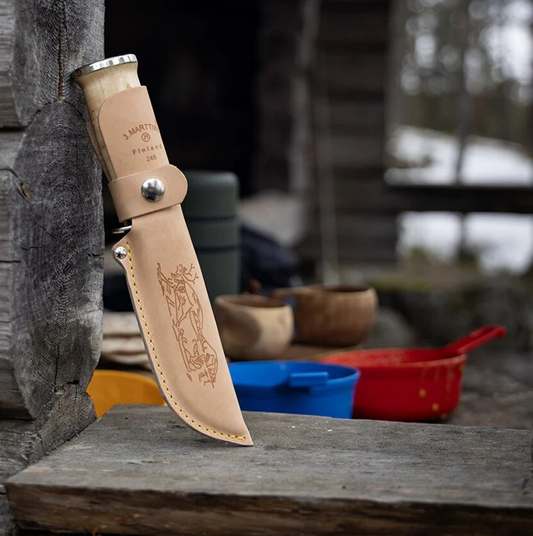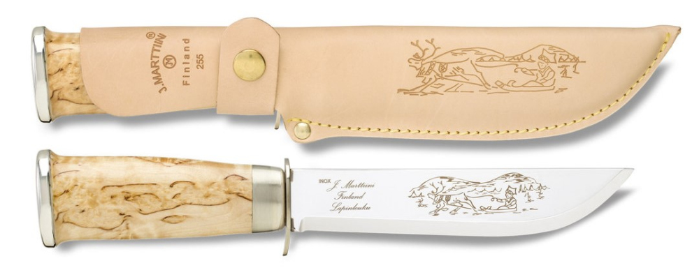 Marttiini Lapp 255 je luxusní lovecký nůž s pevnou čepelí. Čepel je vyrobena z nerezové oceli 440 a má laserem vypalovaný motiv. Rukojeť je vyrobena z finské břízy. Nůž je vhodný pro použití v přírodě i při lovu. Dodáváno v papírové krabičce včetně koženého pouzdra se zapínámím na patentku. Vyrobeno ve Finsku.